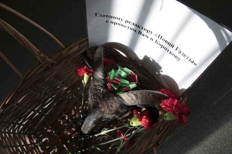 Bilinmeyen kişiler ayrıca, gazetenin önüne üstünde "Korotkov ve Novaya Gazeta baş editörüne selamlar" yazan bir not ile kesilmiş bir koç kafası ve kırmızı karanfiller içeren bir sepet bıraktılar.