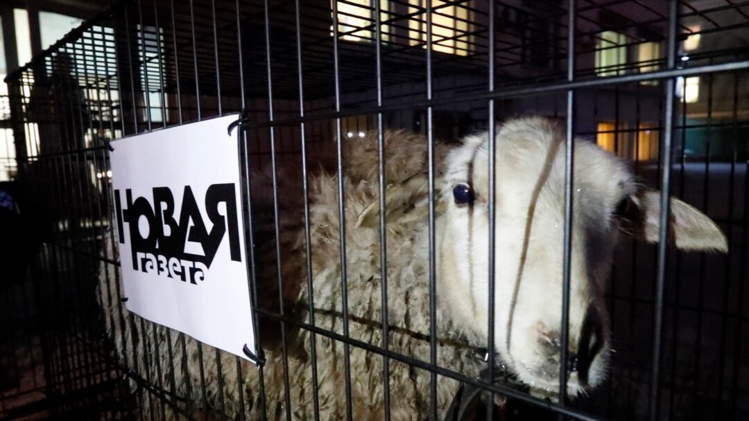 7) Ekim 2018'de kimliği belirsiz kişiler, Moskova'daki Novaya Gazeta ofislerinin yakınında, üzerinde BASIN yazan yelekler giydirilmiş koyunların olduğu üç kafes getirdi.
